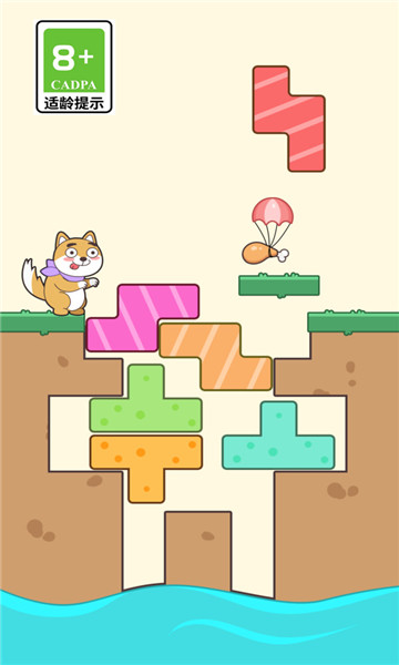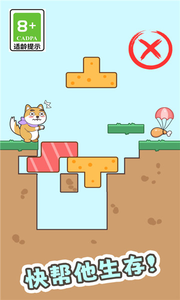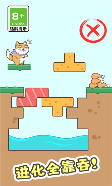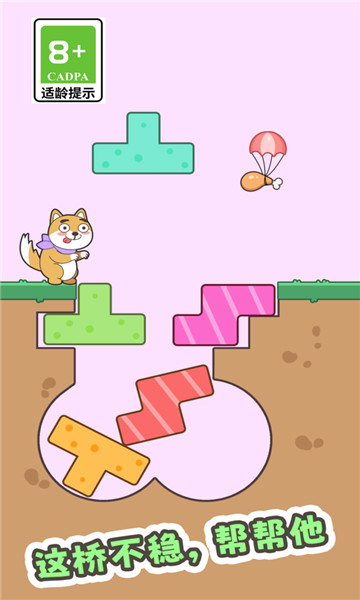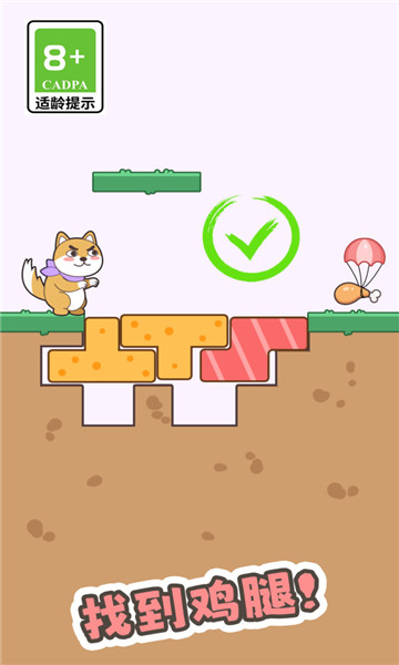 1、游戏中玩家需要帮助细狗搭建一条通道,顺利吃到鸡腿才算成功。
