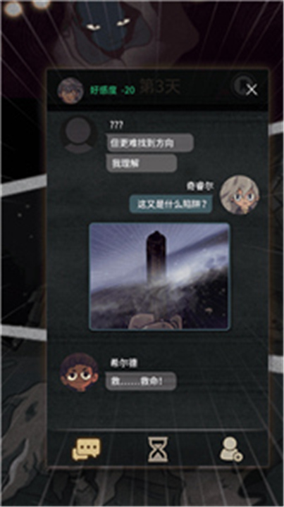 2、游戏采用大家熟悉的聊天室对话形式,玩家需要通过和NPC聊天获取线索并坚持存活七天。