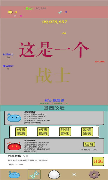 1、通过融合史莱姆来提升它们的攻击力和防御力,每一项得分都在70分左右。