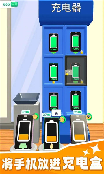 下载手机充电站是一款轻松休闲的游戏内容,游戏中需要将没电的手机放入到充电盒当中,通过充电的方式来赚取一定的收益。整个过程十分轻松有趣,适合打发无聊的时光,千万别给顾客没充满的手机。