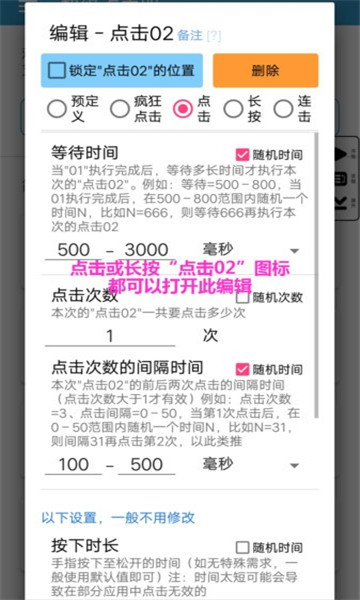 3、可以在线更改点击等待时间,点击次数,点击持续时间及其他点击设定。