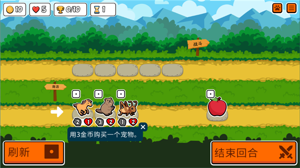 2、每一轮都要选择自己的宠物,给宠物喂BUFF,然后刷新或者冻结宠物。