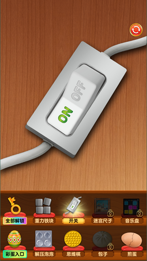 重力铁块、开关、迷宫尺子、音乐盘、玩具手枪、格子音乐、钢琴、美发师、思维连线、手指琴、怀表、七彩音乐、摘花瓣、擦玻璃、沙漏、神秘来电、痒痒粉、激光剑、臭包、拉链、手机玻璃、射击场、乒乓球、剥豌豆、指尖陀螺、推子、喷雾、泡泡机、玻璃珠、加特林、神秘呼吸、磁铁、解压泡泡、思维棋、包子、煎蛋。