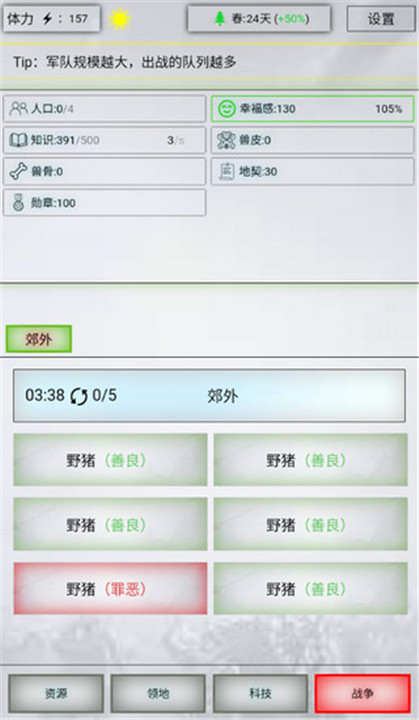 掌握更多的技能,挖掘更多的资源,招募更多的士兵,组成新的团队一起承担风险。