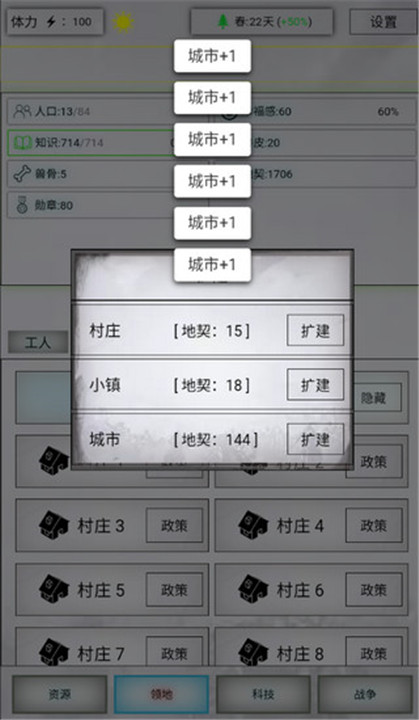 1、想要提升人口数量,需要通过建造村庄、小镇或城市来实现,而这些建设都必须消耗地契资源。