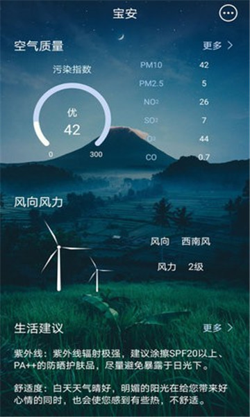 2、每天精确的空气品质资料和体贴的卫生资讯,让你随时知道你所处的都市的状况,保障你的身心健康。