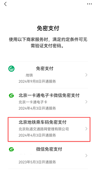 7、这里是我们开通的一些免密支付服务,点击不需要使用服务,如【北京地铁乘车码免密支付】。