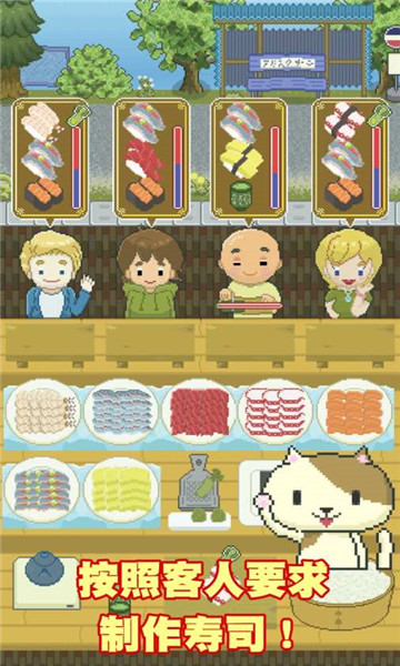下载寿司小摊是一款十分轻松休闲的模拟经营类游戏,游戏采用经典的像素风格,让玩家在这里感受轻松治愈的氛围。努力经营好自己的寿司店,制作并贩卖各种口味的寿司来满足广大顾客,赚取更多的收益。