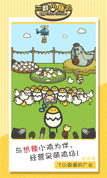 下载一群小辣鸡是一款非常可爱的模拟经营类游戏,玩家作为一个农场的农场主,需要想办法提高农场的利润赚更多的钱,把重点放在鸡上,建造更好的鸡棚,培育新鸡,扩大鸡圈,多买鸡,农场交易不仅可以卖鸡肉还可以卖鸡蛋。