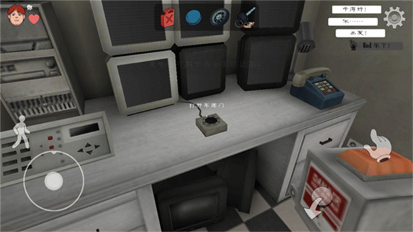 2. 玩家需要利用地图上的道具来逃离冰淇淋店,点击右侧的"手"图标来拾取道具,点击左侧的人物图标则可以下蹲。