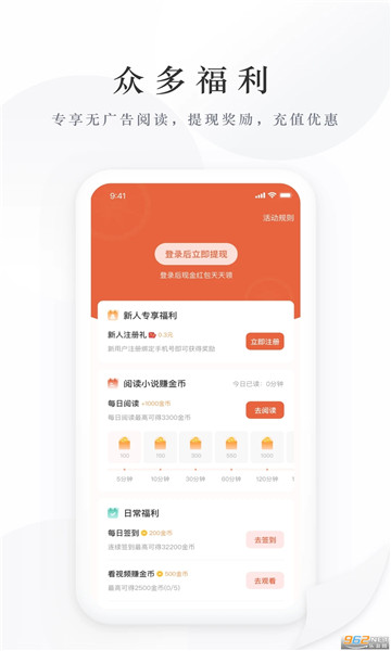1、【福利中心】软件中的各种签到、看书、吃饭等等,一应俱全。