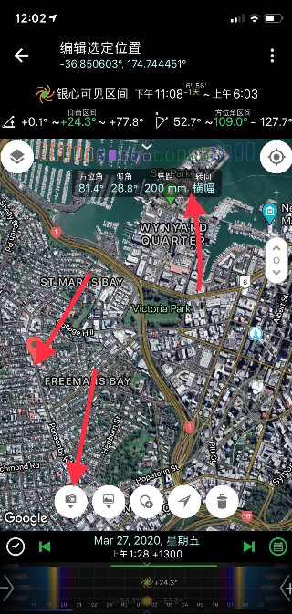 2、红点是选择好的机位,左下角的相机图标就是【选择拍摄点】。中间选择你的镜头焦距,我当时手里只有一只200mm。