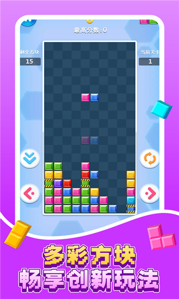 3、游戏目标是消除所有障碍物,每过一关,奖励一定数量方块。用完所有方块或方块堆叠到顶端,则游戏结束。