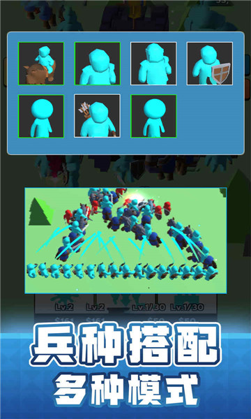 2、士兵需要什么样的武器,你可以自己设计,各式各样的阵容和布阵等等,可以让士兵拥有各种各样的能力。