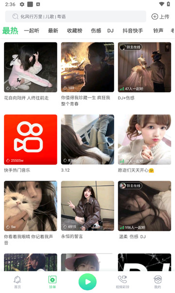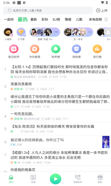 1、这个应用程序里有很多流行的音乐和手机铃声,并且会不断的刷新。