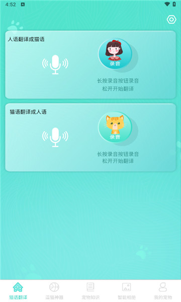 下载宠猫翻译是一款智能化的小动物语音翻译系统,能够将小动物的语音、动作等进行实时的翻译。用户可以根据自己的喜好,对自己的宠物进行语音、动作等方面的信息进行分析,给出对应的译文,还能将译文存档,以便与其它的宠物主共享,还能对宠物的健康进行指导,让人们对动物有更深刻的认识和爱护,让更多的宠物与动物之间的亲密交流。