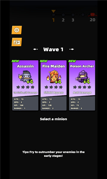 1、游戏中有超过十位以上的英雄可以选择,每一位都拥有各自独特的能力与天赋。你可以选择你喜欢的,也可以选择适合你的策略来组建你的队伍。