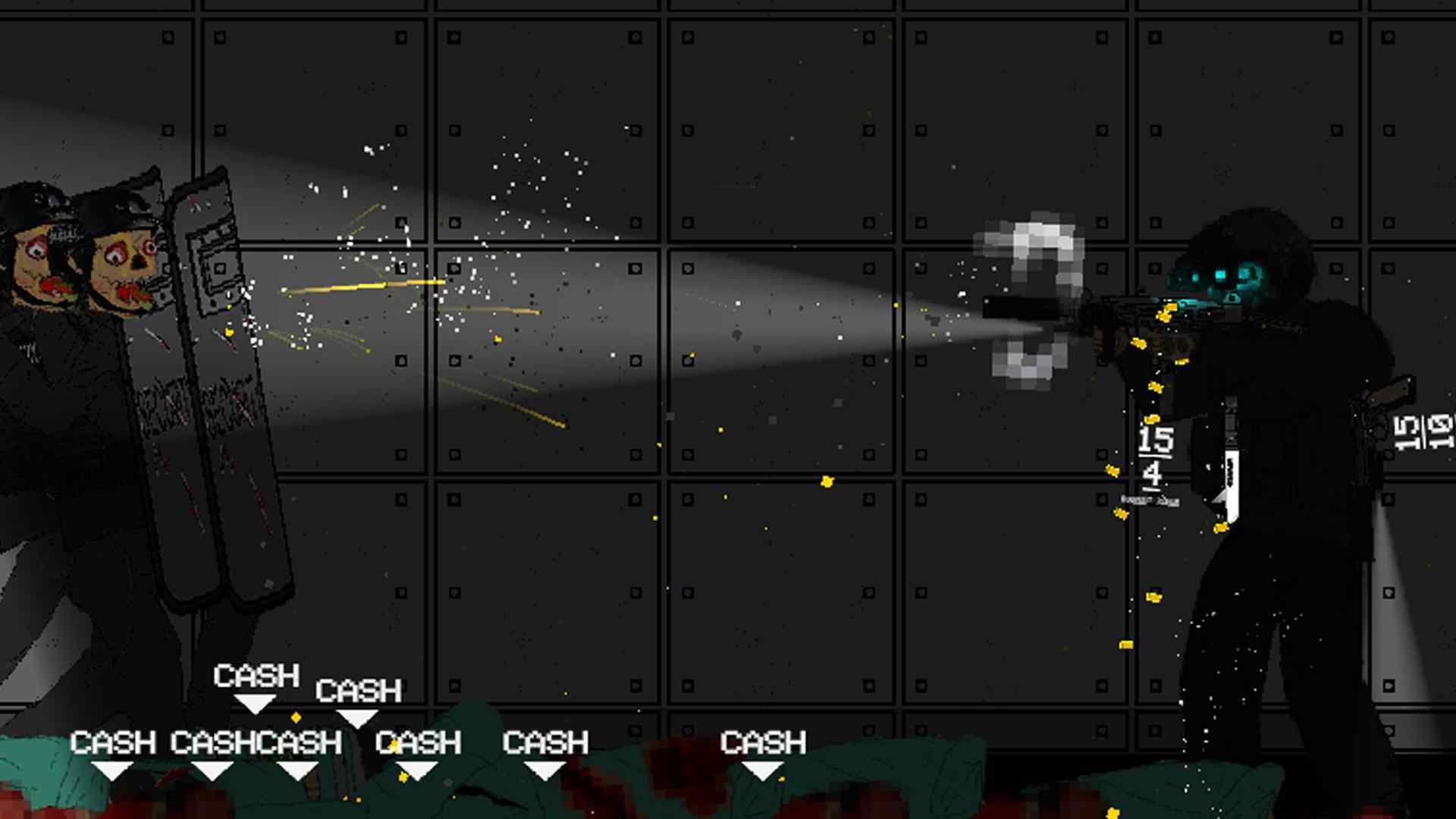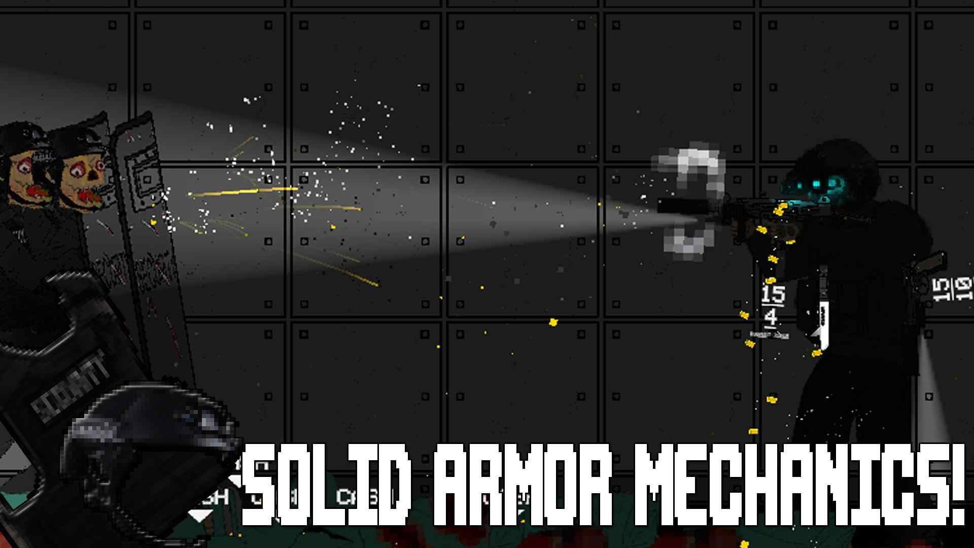 1、在这里和丧尸近身搏斗,也可以用手中的兵器来射杀丧尸,这款游戏以像素化的方式展现。
