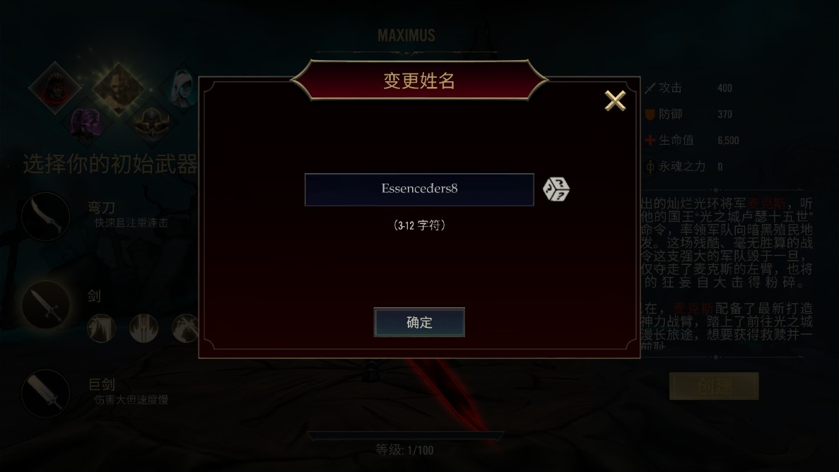 2、进入游戏后,先选择你的初始武器,并创建游戏角色。