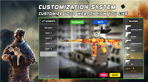 3、在任何场景中可以任意切换不同类型的兵器,亲身体会到真正的枪支打击,才能达到最逼真的战斗效果。