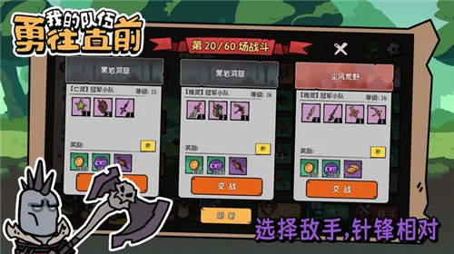 下载我的队伍勇往直前是一款非常魔性的肉鸽类游戏。在游戏中,玩家将通过招募佣兵来组建自己的最强战队,然后出去选择敌手进行对决。带领你的卧龙凤雏们无脑冲锋,享受电子斗蛐蛐的乐趣!没有体力限制,不氪金,随时随地点开即玩!