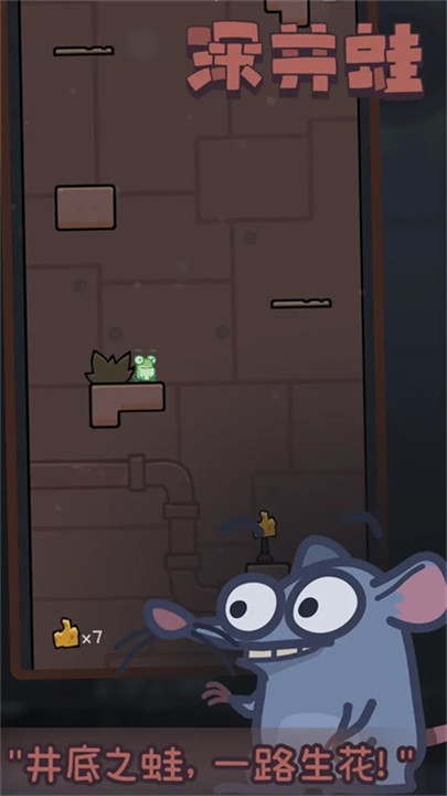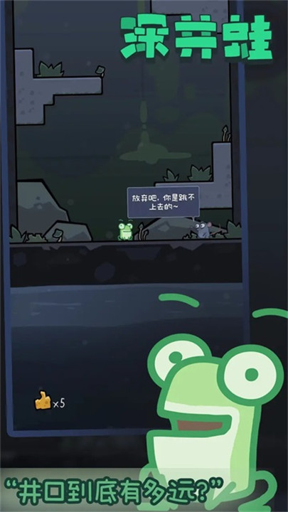 跃入深井蛙下载的奇妙世界,操控这只可爱的蛙蛙,勇敢向深井外的未知高度进发!深井蛙游戏下载中文版以简洁流畅的点击操作为核心,让你在不断跳跃中感受紧张刺激与轻松愉悦的完美结合。深井蛙安卓版下载安装中的每一次跃动都伴随着幽默的鼓励或调侃,增添无穷乐趣,激发你突破极限的欲望。丰富多样的关卡设计与精致细腻的画风,带你穿梭于神秘的地下城、奇异的地质奇观,挑战自我同时享受视觉盛宴。深井蛙下载注重跳跃的技巧与节奏,更巧妙融入趣味互动,让每一跳都充满惊喜和新鲜感。