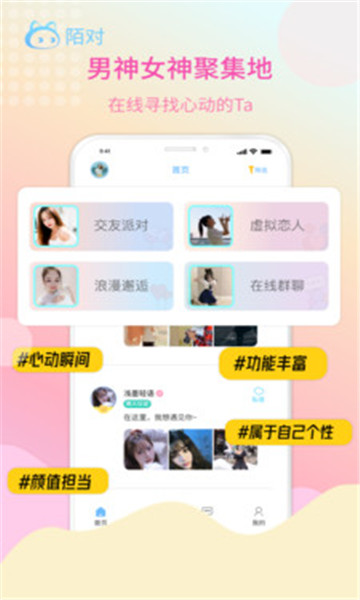 下载陌对是一个针对年轻人打造的交友应用,这是一个很高级的社会平台,提供了很多有趣的方式,让你可以在线上自由地交谈,结交更多的新朋友,也可以加入很多有趣的主题,在任何时候都会有人回应,不会觉得寂寞,轻松与ta进行交流沟通。