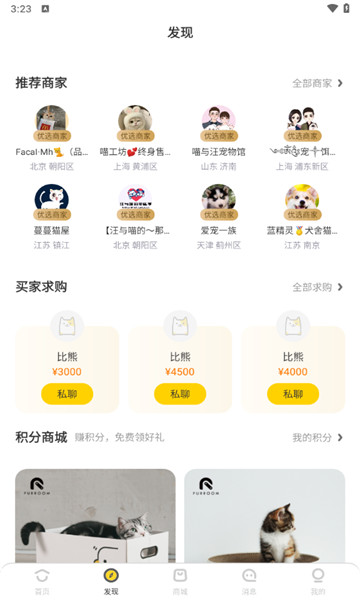 1、用户可以在商城的各个类别中看到各种各样的动物,如果有中意的,可以私信老板,询问具体的信息。