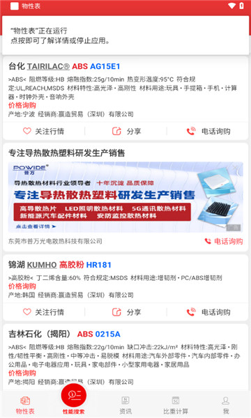 下载物性表是一款原料查询和搜索应用,可以查找到许多商品,让使用者能够迅速准确地得到相关的资料和回答,并且还可以用到一个计算器,材质表格能够让使用者根据自己的需要来选择,通过查找之后,能够知道详细的资料,包括厂家、类别、序号等等,而且种类非常的丰富,为使用者的工作提供了一个最为专业的平台。