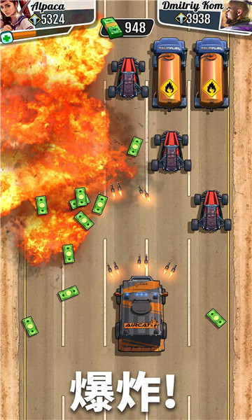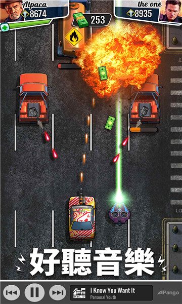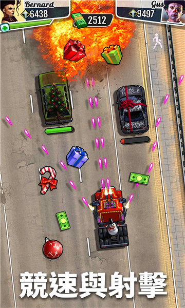 1.火爆的对战过程,你有多种强大的武器供你挑选,让你在高速跑道上展开一场惊心动魄的枪战。