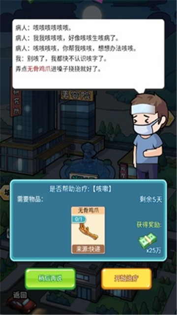 2、提升装备技能,使用合适的医疗手段,就是给患者治病,赚更多的钱。