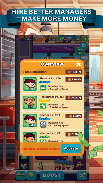 3、将饭店进行升级,获得更多的金钱,并获得海量的资源。游戏很有趣。