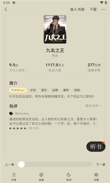 1、为读者提供了夜间模式,自动书签,缓存下载等各种实用的特性,使读者在轻松的环境中轻松地看完一本书。