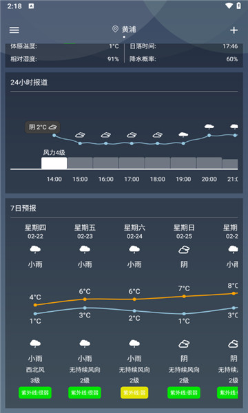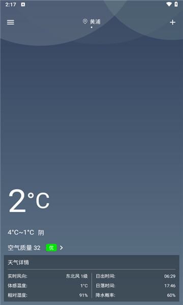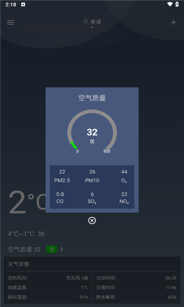 2、全面的气象预测,包括气温,空气质量,湿度,风向等等。