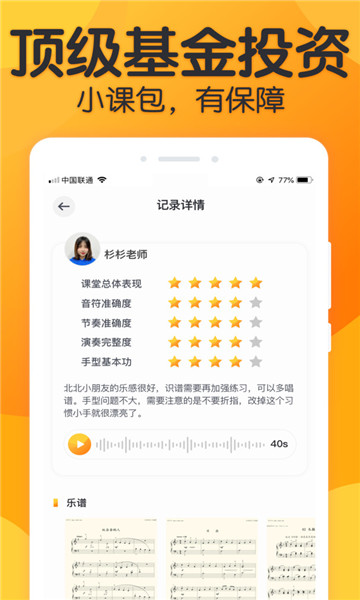 3、app内含实时互动功能,学员在练习过程中可以得到专业老师的实时指导和纠正,提升练琴效率。