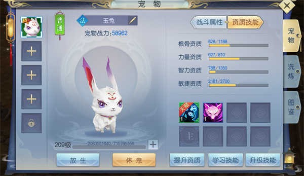 出战的宠物与角色一同战斗时,会获得经验。也可以使用经验道具,为宠物提供经验。通过资质提升、学习技能、升级技能可以提升宠物的属性。通过洗炼,可以改变宠物的属性和品质。