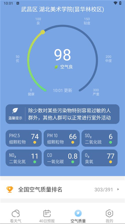 4、空气质量指数提醒用户注意空气质量,避免由于天气变化给身体带来不良影响。