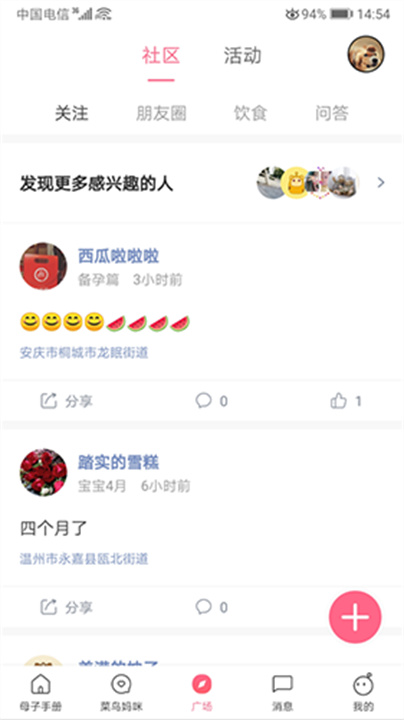 3、在“广场”模块,可浏览各地宝妈分享的育儿日常与趣事,发现更多生活灵感。