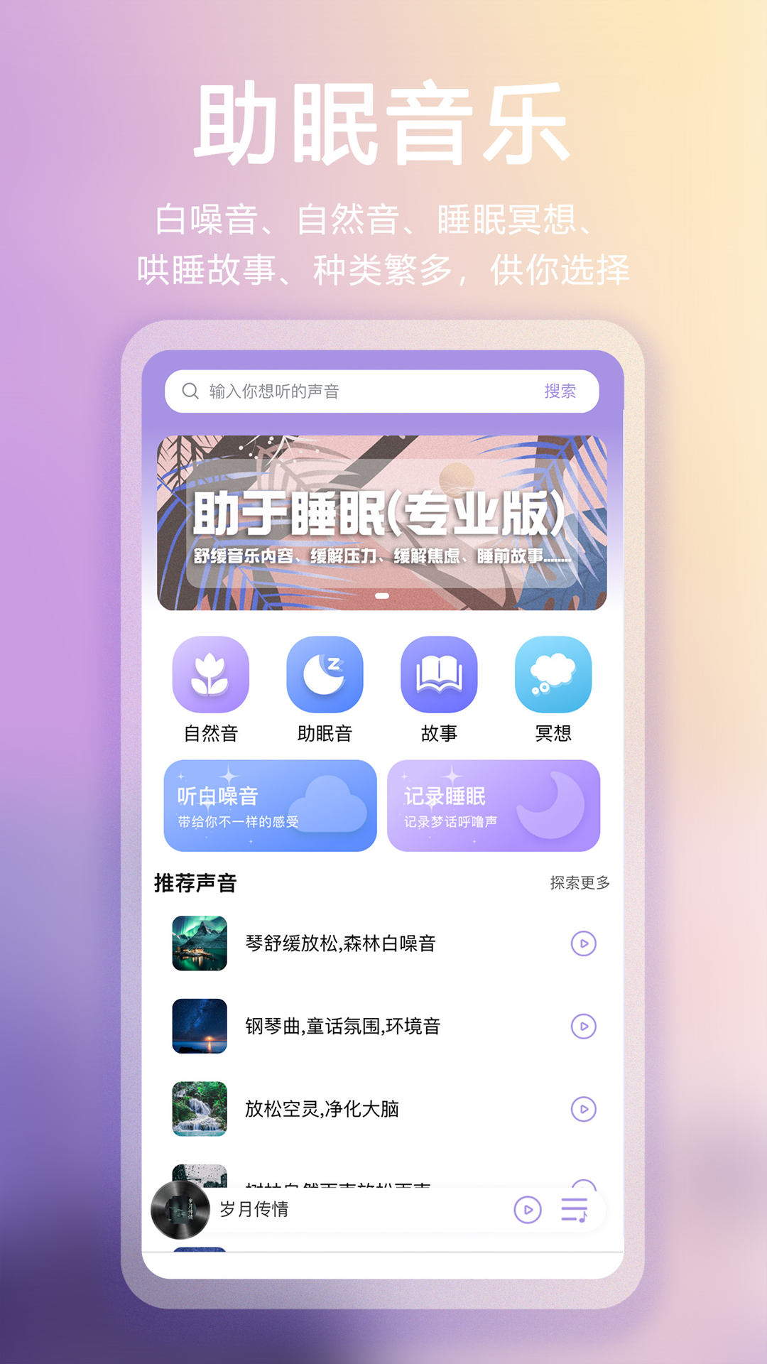 2.提供丰富的助眠音频(白噪音、冥想、呼吸练习等)、睡前放松训练及睡眠建议,帮助用户快速进入深度睡眠。