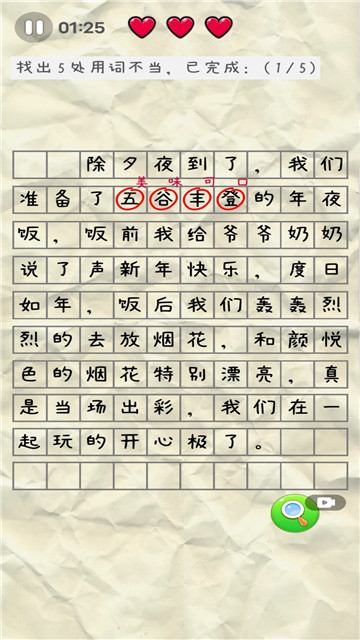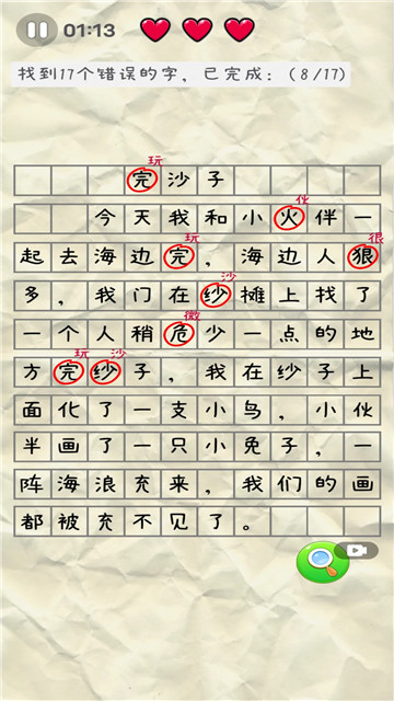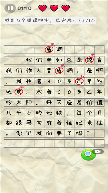 2、玩家要注意看每一层的字迹,发现并指出其中的错别字,每一层的错别字都是不相同的。