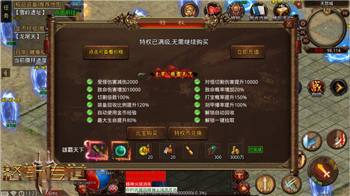 特权受怪伤害减伤100,切割伤害提升1000,打宝概率提升10%,装备回收比例提高20%,自动金币经验。