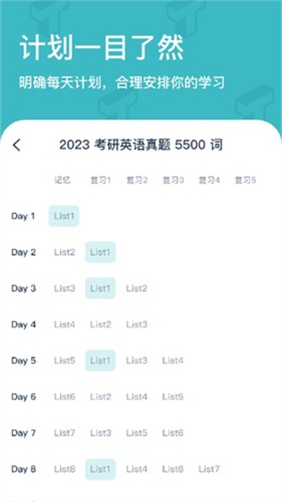 当进入具体学习日程(如Day2),屏幕中央将直观展示当日List内的全部词汇,用户可逐一点击查看释义及用法,结合卡片式展示设计,强化识记体验,使记忆过程更高效、有序。