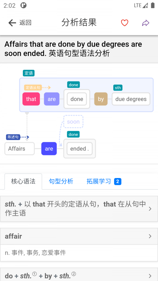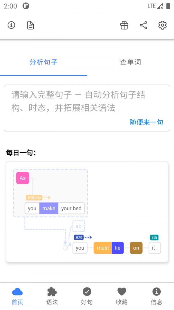 3. 深度语法分析:一键解析句子结构,清晰展示词汇、短语、句型等语法元素,提升用户英语理解与运用能力。