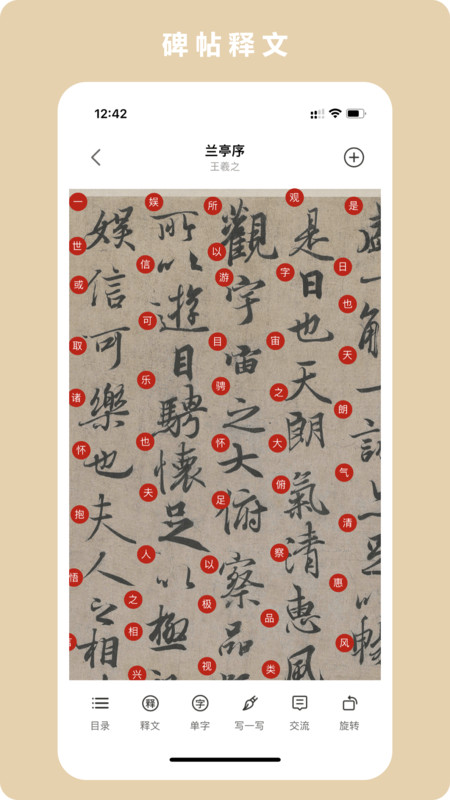 1. 高清碑帖展示:提供高清碑帖图片与逐字放大功能,让用户清晰观察笔画细节,深入研习。