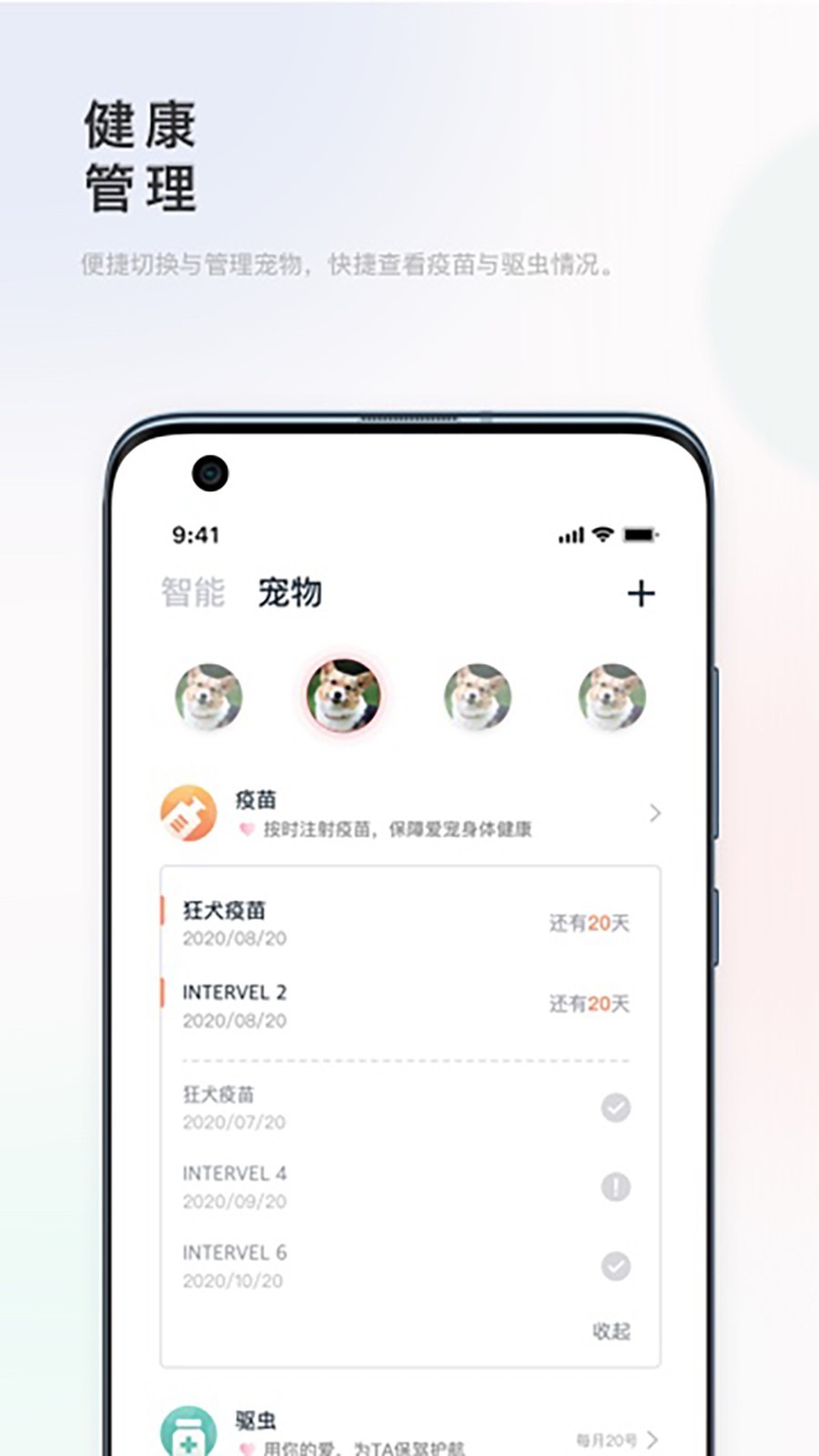 4. 宠物档案:用户可创建宠物专属档案,记录体重、疫苗、驱虫等信息,方便管理宠物健康,提醒重要事项。
