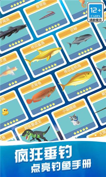 1、游戏中玩家将努力成为一名钓宝大师,各种丰富的宝藏和鱼类等你来解锁图鉴。