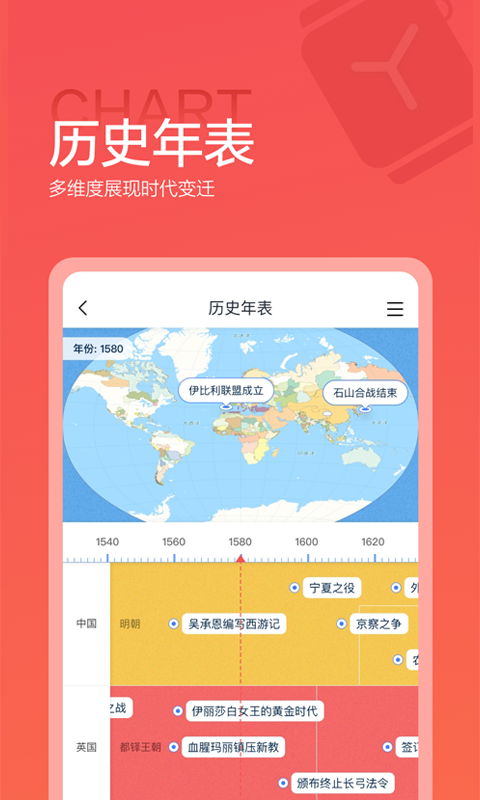 全面的历史时空:时间轴和时空地图让用户轻松跟随历史的步伐,了解从古至今的重要事件。历史的每一瞬间,都能通过地图和时间轴得到细致的解析。