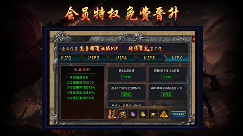 3.打怪过程中收集转生凭证、炼体丹,在转生、炼体界面提升自身等级,达到五转可前往二大陆,获取更高级的装备。