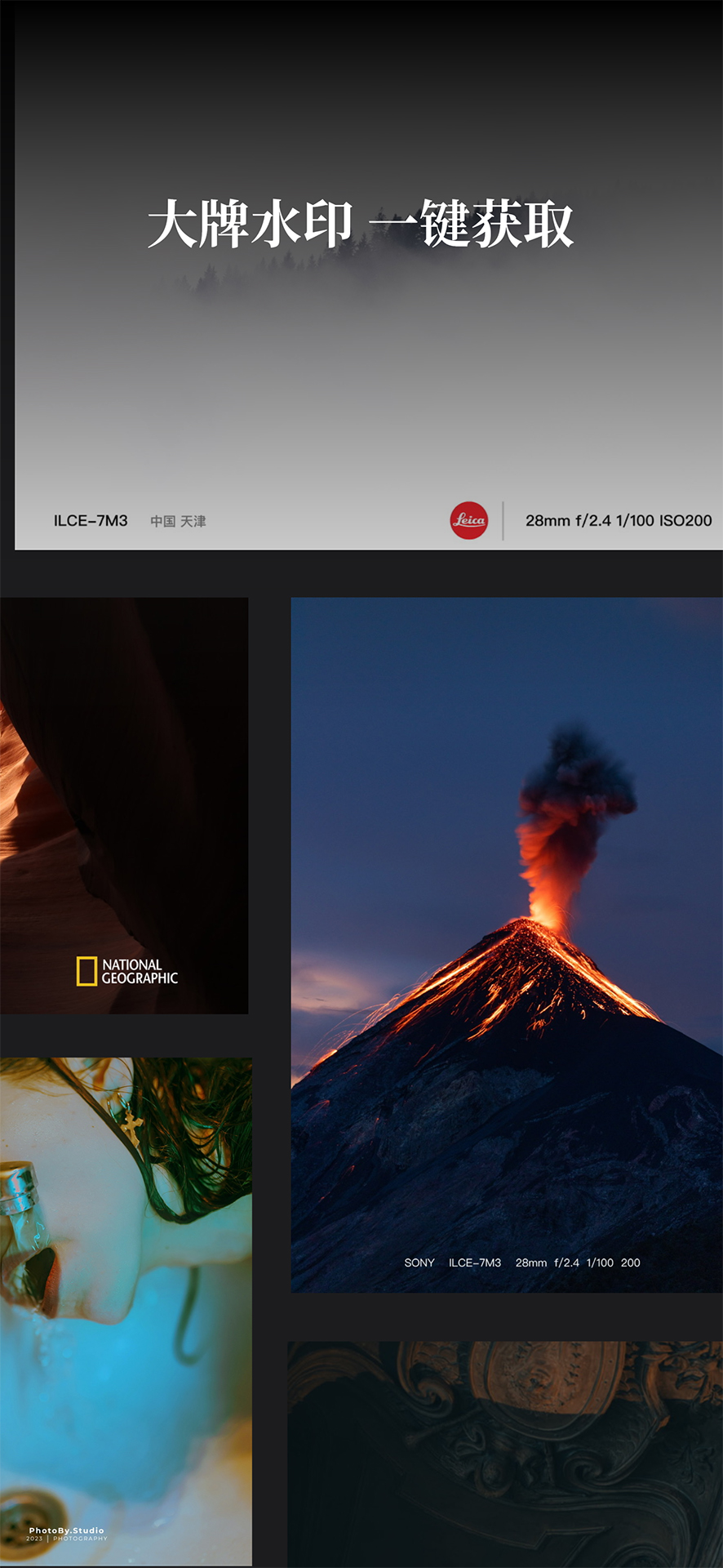 下载1. 品牌水印库:内置索尼、徕卡、哈苏等知名相机品牌的水印模板,一键添加,彰显作品格调。