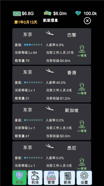 下载模拟经营航空大亨模拟器是一款模拟经营休闲小游戏,在游戏当中,玩家可以任意兴建机场,开辟新航线,只要机场能够拥有充足的人员,就可以尝试着将你的机场覆盖到全球所有的热点城市,并且将你的公司打造成500强。